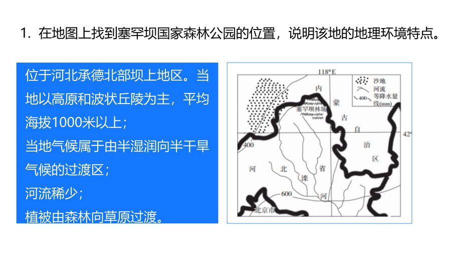 在地图上找到塞罕坝国家森林公园的位置,说明该地的地理环境特点。