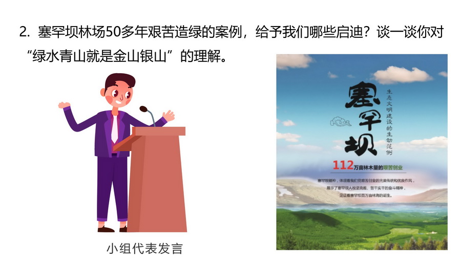 塞罕坝林场50多年艰苦造绿的案例,给予我们哪些启迪?谈一谈你对“绿水青山就是金山银山”的理解。
