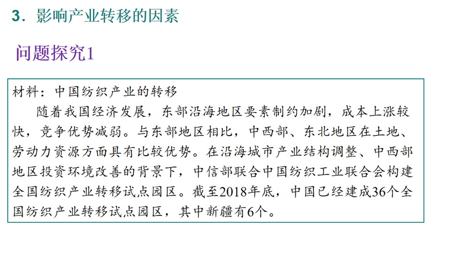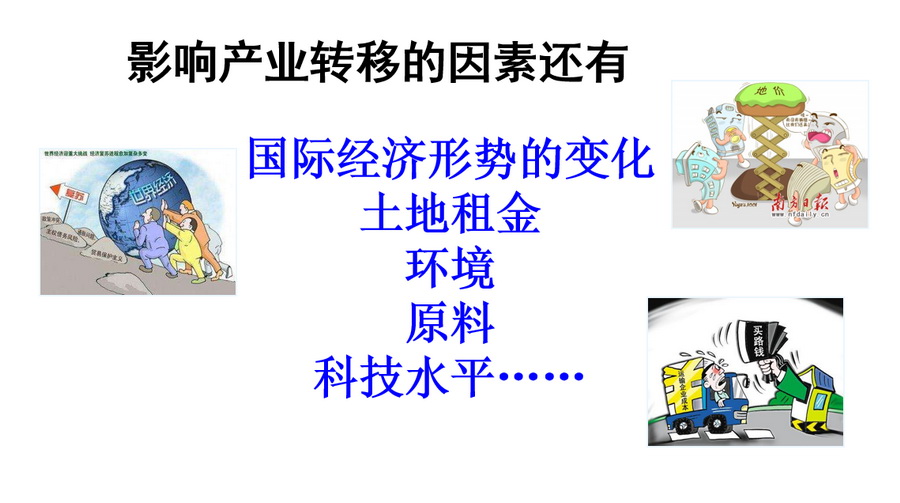自主探究:通过案例材料中国纺织业的转移、欧美汽车产业向我国转移、深圳出口加工区总结影响产业转移的主要因素。