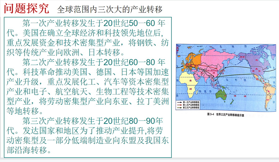 通过探究全球的三次产业转移和东南亚产业转移特点,归纳总结产业转移的一般规律。