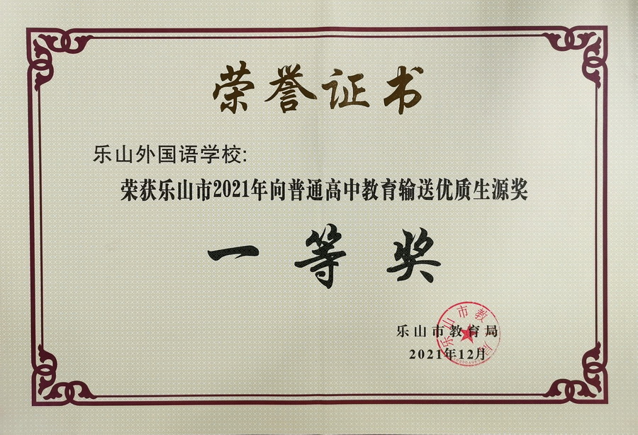12月29日召开的乐山市2021年度高中教育质量综合评估会上,乐山外国语学校凭借2021届高考的优异成绩,荣获乐山市2021年普通高中教育质量“特别贡献奖”和“向普通高中输送优质生源一等奖”。