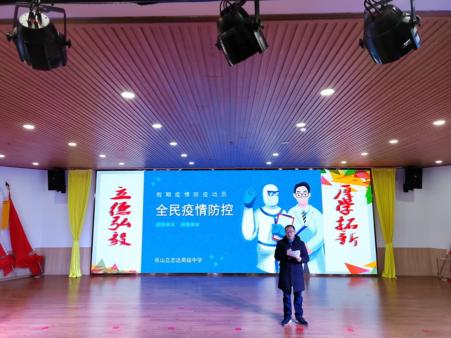 当前全球新冠疫情大流行仍处于高位运行,防控形势依旧严峻复杂,为认真落实省市相关部门的决策、部署和要求,毫不放松、科学精准、从严从紧切实做好乐山立志达高级中学2022年春节和寒假期间的疫情防控工作,坚决避免疫情在校园内传播扩散,确保全体师生生命安全、身体健康、校园稳定和假期平安。德育部副部长安全办公室主任邓晓宇做了假期疫情防疫动员。