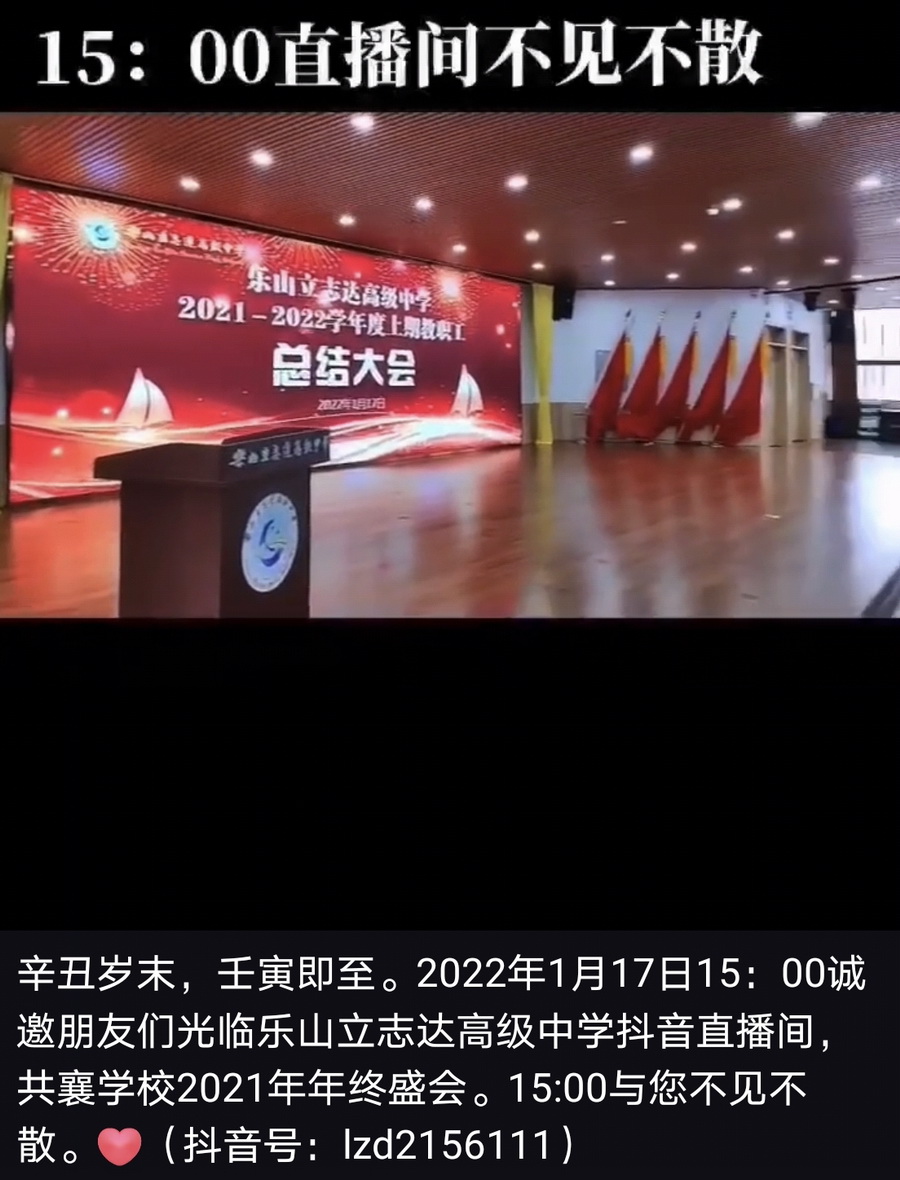 2022年1月17日下午15时,乐山立志达高级中学2021—2022年度上学期工作总结会在学校学术报告厅隆重召开,总结大会通过官方抖音号在全网进行了全程直播。会议由马立新副校长、罗雨倩老师主持。