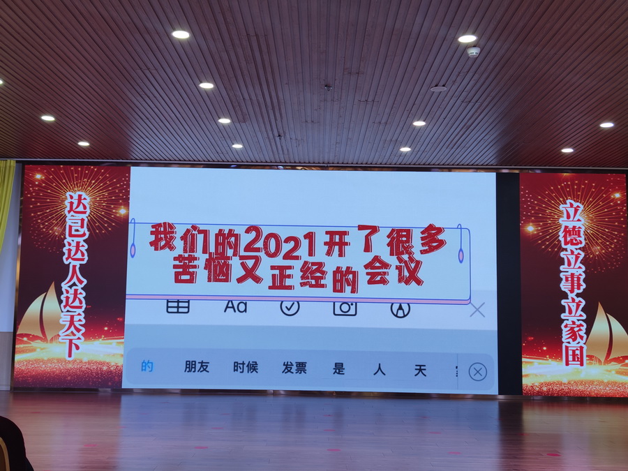 张总经理对全校教职工的付出表示了感谢,用四句话精妙概括了参会的心情:与时光共好,在过去一年,中国共产党迎来建党一百周年,中国防疫取得了好成绩,在如此好的时代展望,立志达的明天一定会更好。与万物和解,全校教职工要学会在工作中调解自己的情绪,努力到无能为力。让过去清零,过去的成绩已经过去,我们要让过去过去。让未来可期,2022年乐山立志达高级中学招生工作将正式启动,也将迎来第一次高考,将让更多的学生进入大学的门槛。