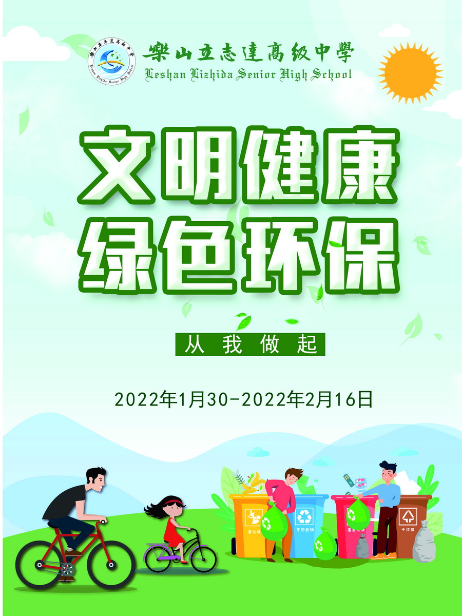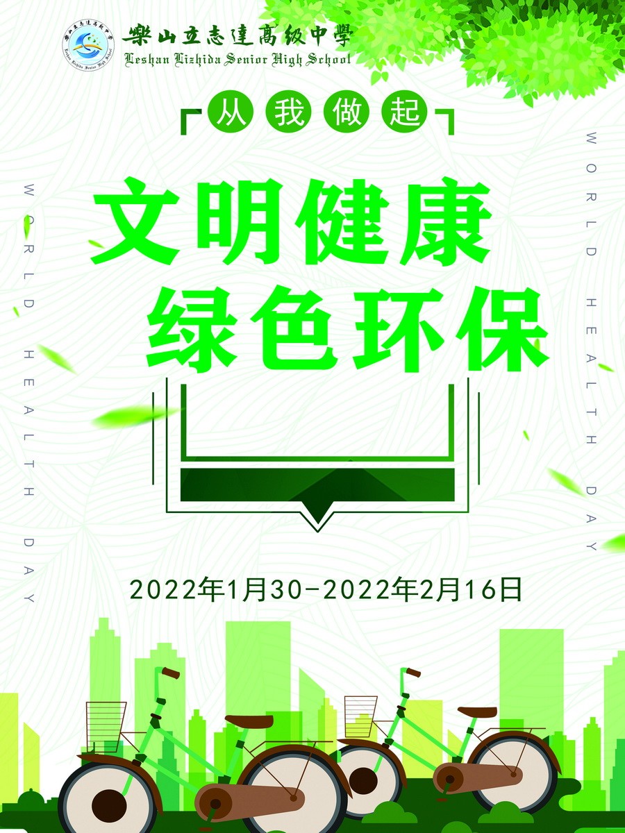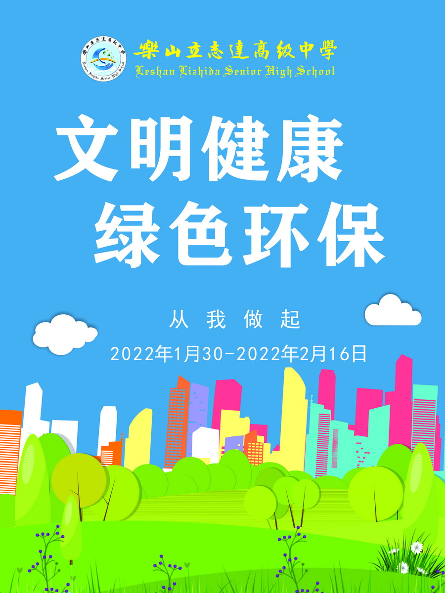 为在春节期间全面提升自我防病意识和健康素养水平,推动形成文明健康、绿色环保生活方式,筑牢常态化疫情防控的社会大防线,我们向乐山立志达高级中学的全体学生、教职工发出倡议——文明健康 绿色环保!从我做起。