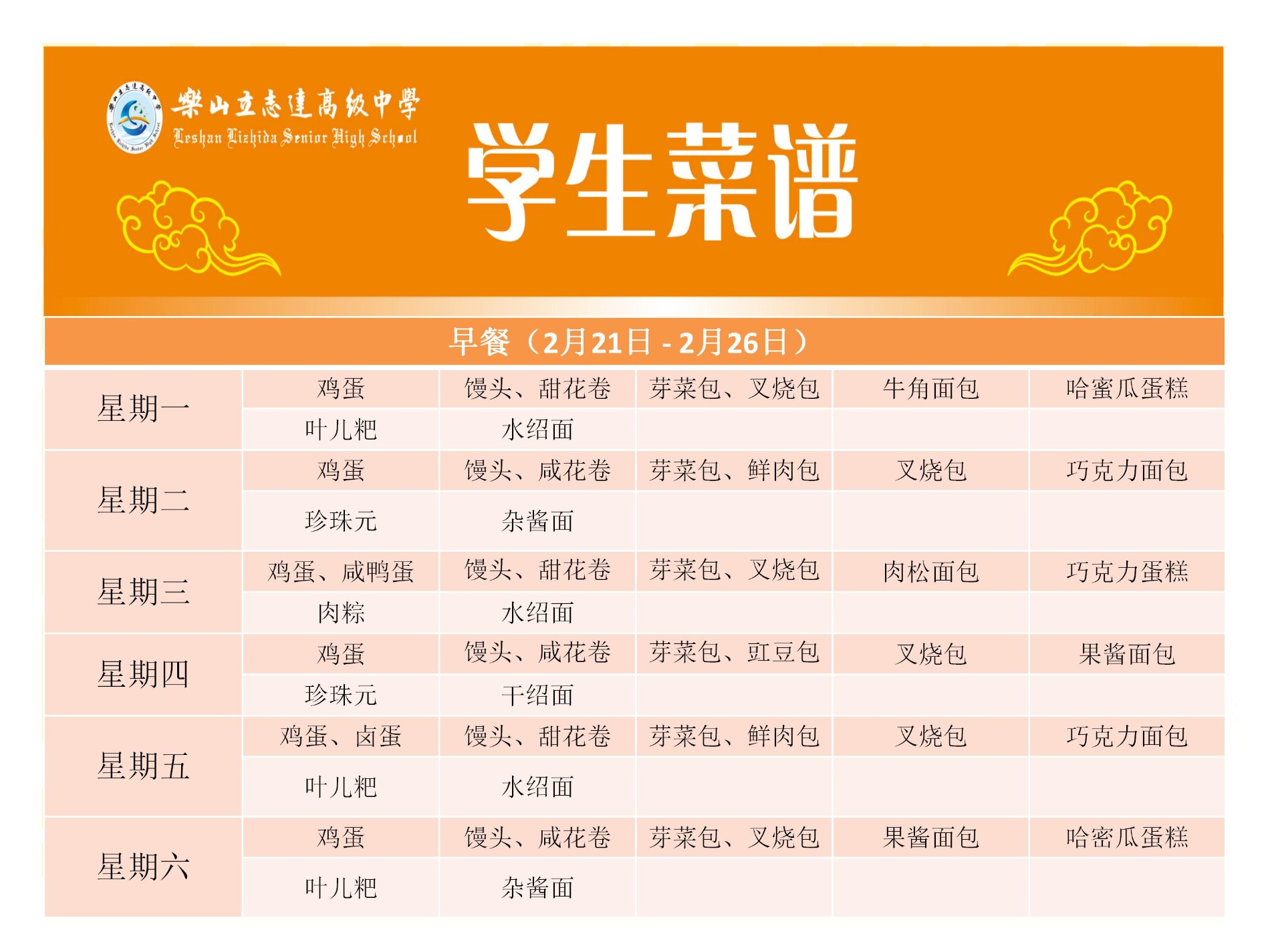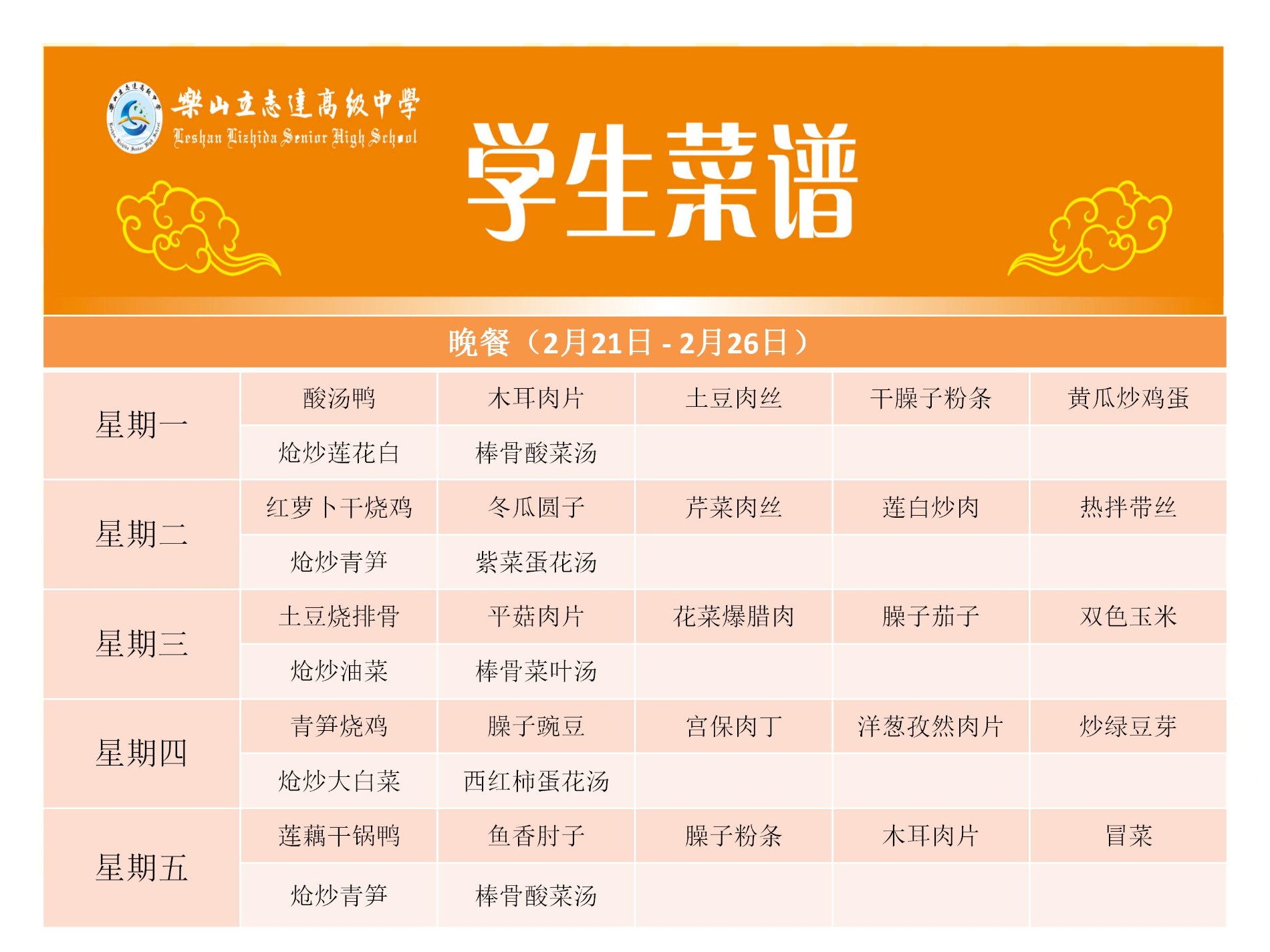 2021-2022学年下学期 第二周菜谱