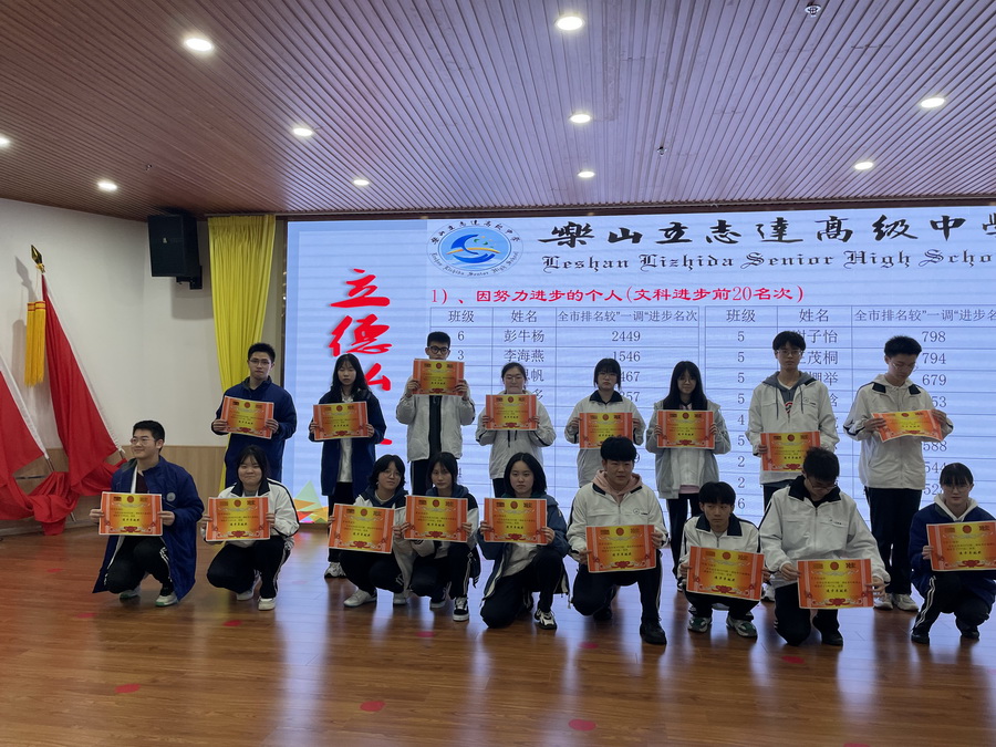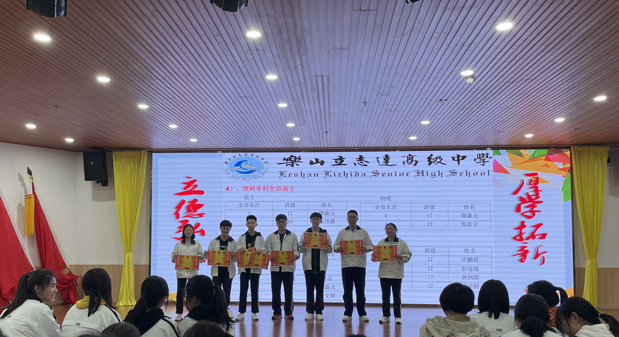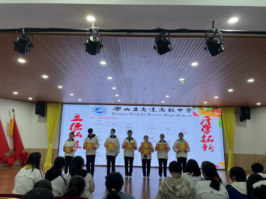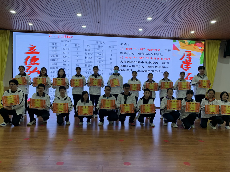 但立直标,终无曲影。崇尚英雄才会诞生英雄,争做英雄才会人才辈出。在“二调”考试中,一大批优秀学生敢于争先,脱颖而出。为了树立标兵,表彰先进,弘扬勤奋好学积极进取的优良学风,营造浓厚热烈的学习氛围,鼓励学生在接下来的学习中继续奋进,学校对乐山市文理科总分前五十名、单科前十名、进步突出的学生进行奖励并颁发荣誉奖状。得意勿傲,失意勿怠,不同的轨迹都有锋芒,希望学生们欣赏得了霞光满天的美丽,亦可于寂夜孤灯揽星光。