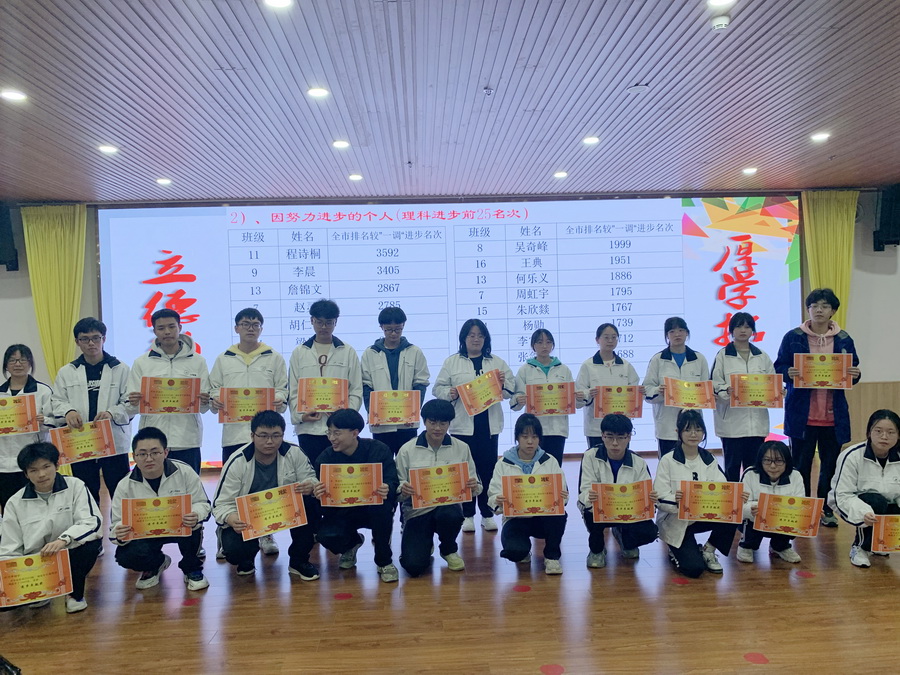 鲜衣怒马少年时,不负韶华行且知。高三学生代表彭佳慧在此次二调中进步显著,她分享了“争分夺秒,科学备考”的学习经验。彭佳慧以自己的切身体会向同学们提出以下三点建议:一是高效利用时间,二是合理舒缓焦虑,三是保持坚持不懈的恒心,以此激励同学们在最后的时间里明确目标,劳逸结合,坚定信念,砥砺前行。她发出呼吁:“加油吧,少年们!无论是为了自己往后的人生亦或是家长的期望,再搏一把,毕竟‘天生我材必有用’,相信不管身处何方,总有一个舞台是为自己而筑,总有一束光是为自己而打!”