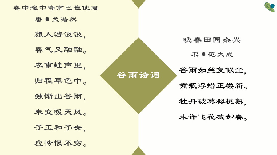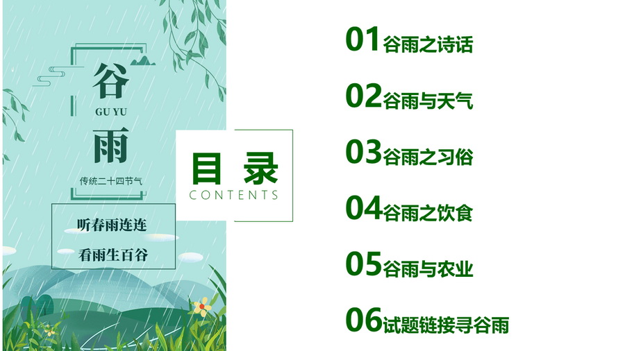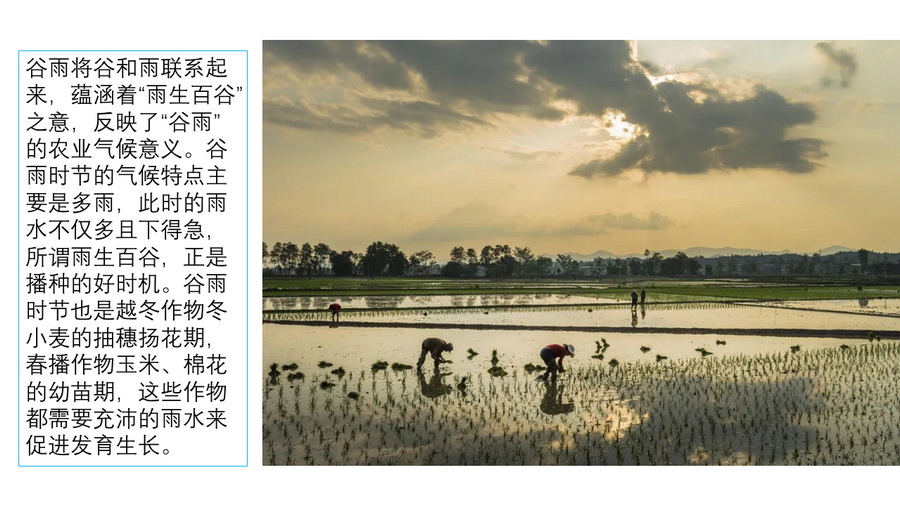 谷雨与雨水、小雪、大雪等节气一样,都是反映降水现象的节气,是古代农耕文化对于节令的反映。田中秧苗初插、作物新种。