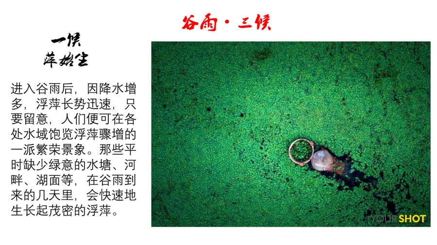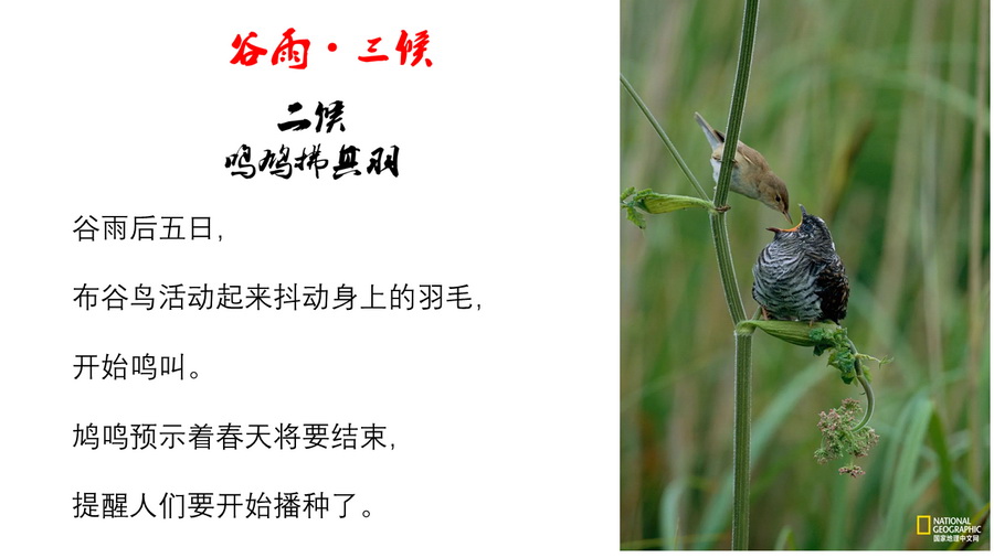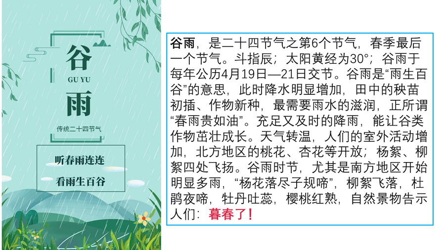 《中国天文年历》显示,北京时间2022年4月20日10时24分07秒将迎来“谷雨”节气。此时节,田中的秧苗初插、作物新种,天气转温,“杨花落尽子规啼”,柳絮飞落,杜鹃夜啼,牡丹吐蕊,樱桃红熟!