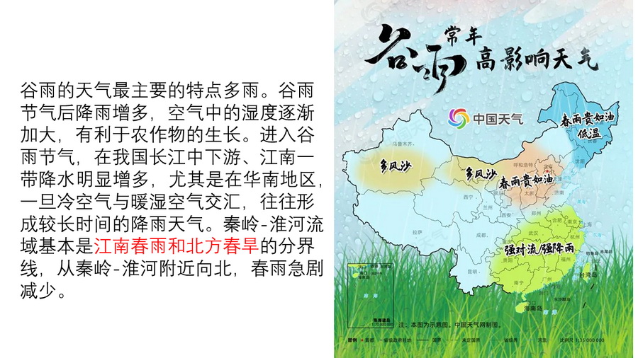谷雨时节,在中国南方地区,降水明显增多,从秦岭-淮河附近向北,春雨急剧减少。秦岭—淮河是南方春雨和北方春旱区之间的过渡地区。