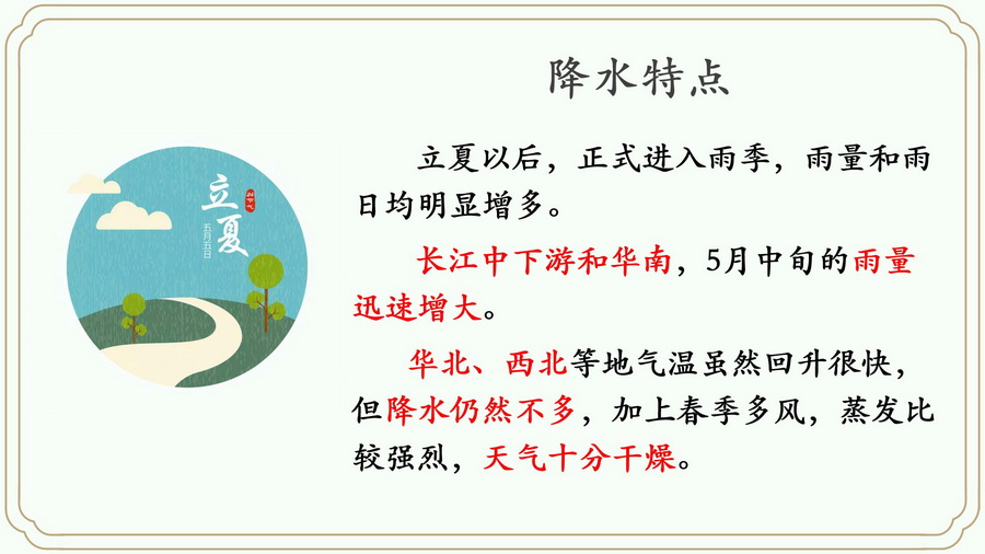 立夏以后,正式进入雨季,雨量和雨日均明显增多。夏季是许多农作物旺盛生长的最好季节,充足的光照和适宜的温度以及充沛的雨水给植物提供了所需的条件。