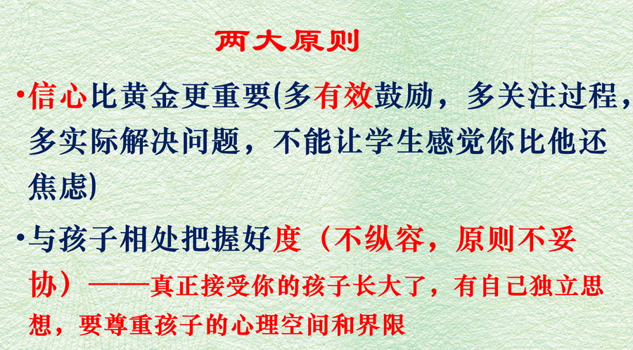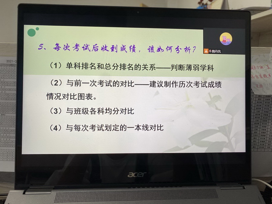 结合具体数据,各班班主任利用腾讯会议首先为家长们介绍了本次期中考试的基本情况,表扬了半期以来各方面表现优秀的学生。班主任指出学习态度端正,坚定不移,勤思善问,踏实勤奋,高效利用时间是取得优异成绩的关键,临近高三,明确的目标会带给我们更多的动力。面对成绩波动,班主任提醒家长关注过程比关注结果更重要,在日常生活中要做有心人,在过程中去发现问题,有针对性地加强改变,真正做到帮助孩子解决问题。对于即将到来的高三,无论是学生还是家长都是第一次经历,为帮助家长了解高三相关情况,做到心中有数,全力协助备考,各班从高三时间安排、家长角色、学生心理等方面为家长做了详细的说明。高三就是一场拼智力、体力、心态、毅力的持久战,班主任们都强调,目标树立与思想引领是激发学生内动力的核心因素,也是支撑高三学生走向高考不竭的动力,要制定符合自己实际的目标,落实课堂,找准自己的学习节奏。除学生外,家长也应做好充分的准备,陪伴是最好的安慰剂,高三备考期间,家长们尽量减少外出和工作中的出差,一方面要照顾好孩子的饮食起居,督促孩子保持良好作息和健康饮食;另一方面多关注孩子的心态和情绪上的变化,少些唠叨,多些鼓励。由于高三高强度的学习安排,在不同阶段都会对学生心态、情绪产生影响,家长要成为孩子的心理导师,“妈妈要成为女孩的闺蜜知己 ,爸爸要成为男孩兄弟般的朋友”,真正做到:能走进孩子内心去,能听到孩子的真心话,能给孩子指点迷津,能让孩子感到敬畏,能让孩子走你为他指引的路,让良好的家庭环境成为孩子温暖的避风港。