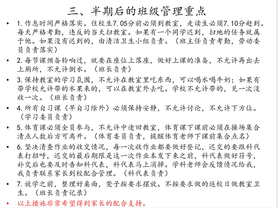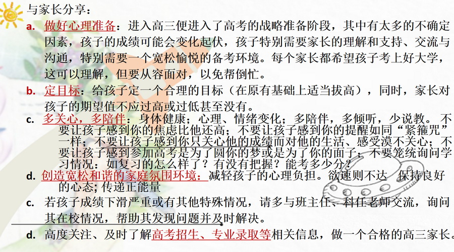 此外,各班还详细介绍了高三期间大型考试时间安排、高考报名、体检、历年高考分数线等相关信息,同时提醒各位家长高度关注各类高考招生、专业录取等相关信息,做一个合格的高三家长。