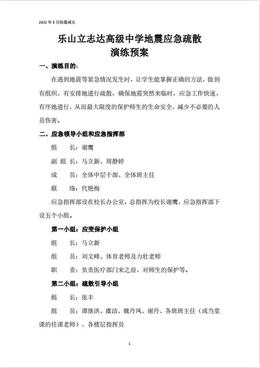 在全国第十四个防灾减灾月期间,为纪念5.12汶川大地震十四周年,促进学校师生了解避震、疏散等地震应急避险知识,掌握应对突发事件采取的防护措施和方法,提高师生地震应急逃生处置能力,2022年5月11日上午,乐山立志达高级中学组织全体师生进行了全国“防灾减灾月”防震应急疏散演练。