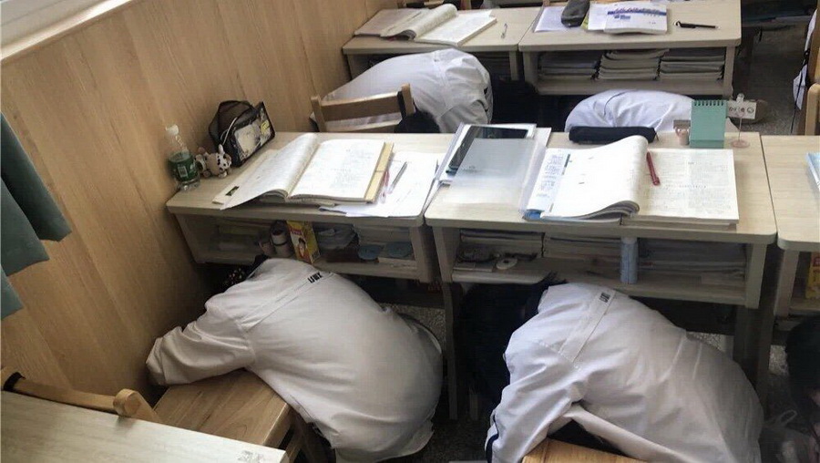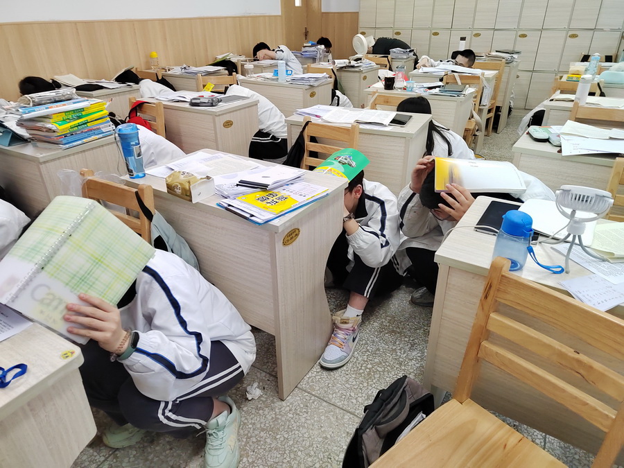 上午10:15,演练启动。紧急避险信号一响,全体人员严格按照安全疏散的应急预案,进入各自岗位,引导学生按要求护住头部。学生们有的蹲在内墙脚,有的躲在桌底下抱住桌腿。2分钟后,各班学生在老师指挥下按照指定的安全出口,有序地离开教室,紧急撤离到安全地带。