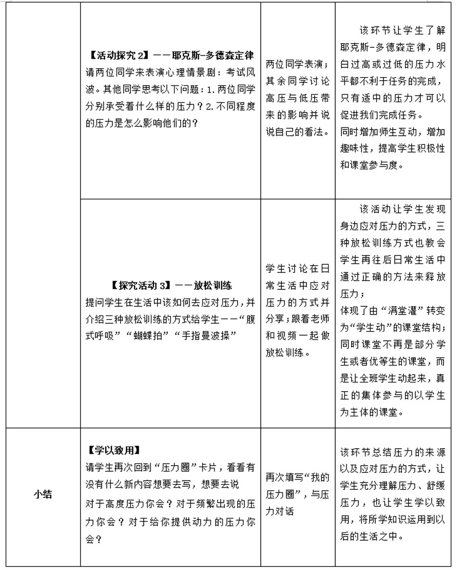 本节课针对高一学生身心发展水平,通过体验式的课堂活动,引导学生正确认识压力、接纳压力;并鼓励他们通过特有的方式与压力和谐共处。