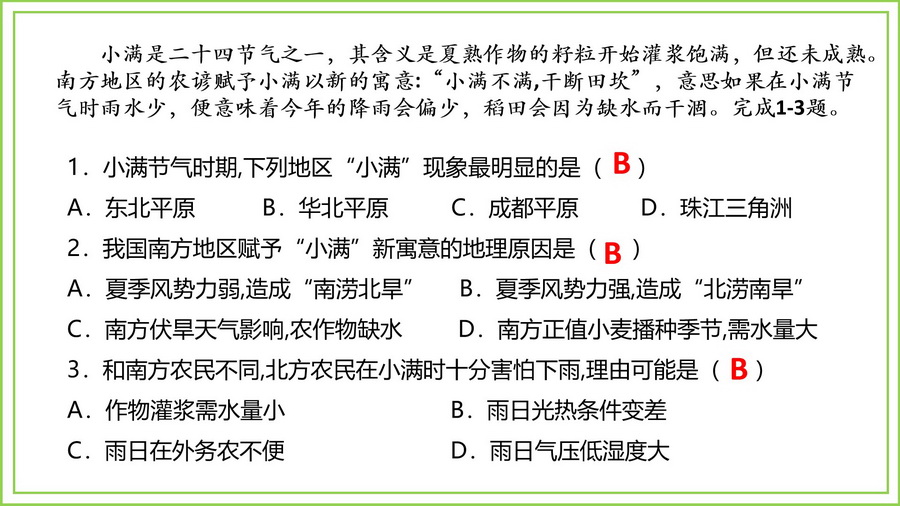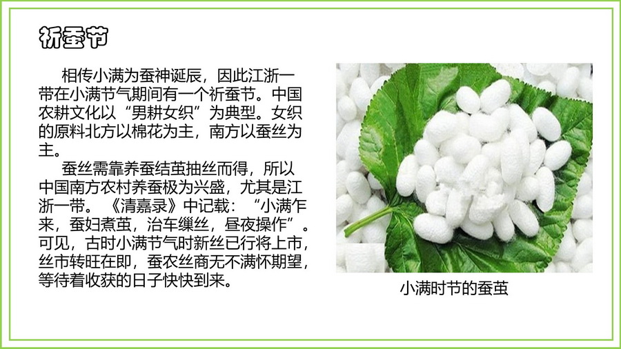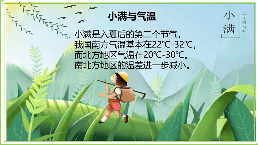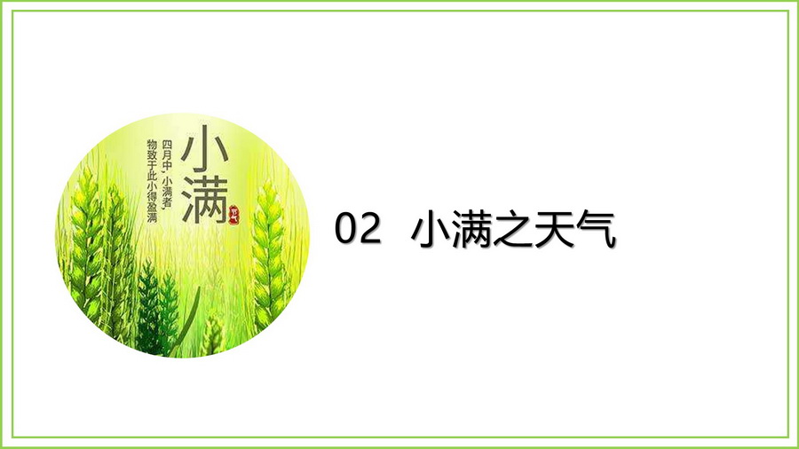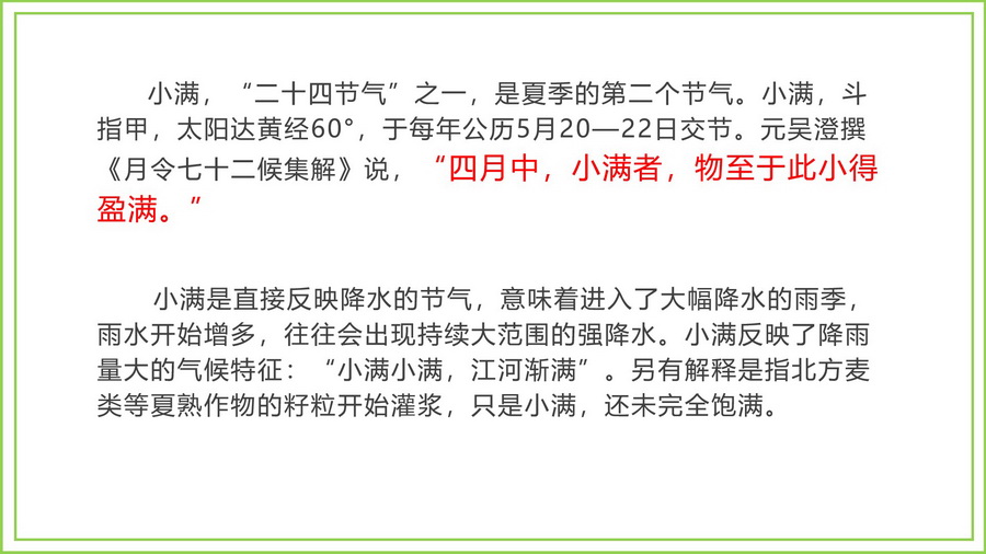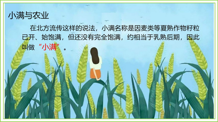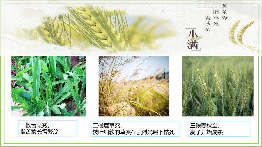 小满时节,我国北方地区因麦类等夏熟作物籽粒已开、始饱满,但还没有完全饱满,约相当于乳熟后期,因此叫做“小满”。