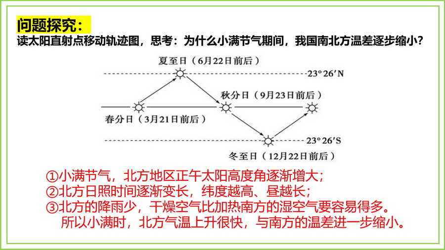 小满节气,我国南方地区、北方地区气温回升速度快,并进一步接近。探究小满节气前后我国南北方气温差异变小的原因。