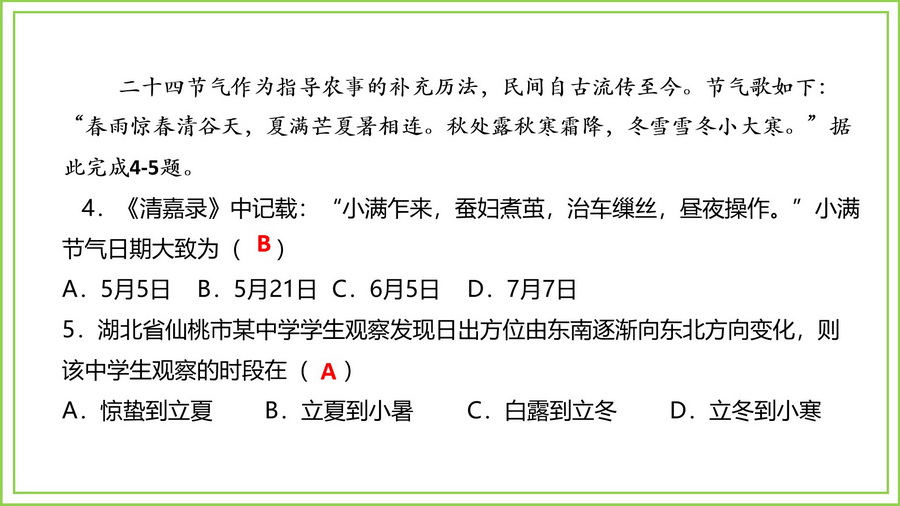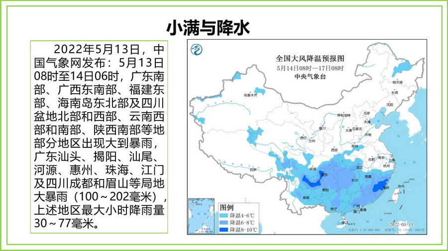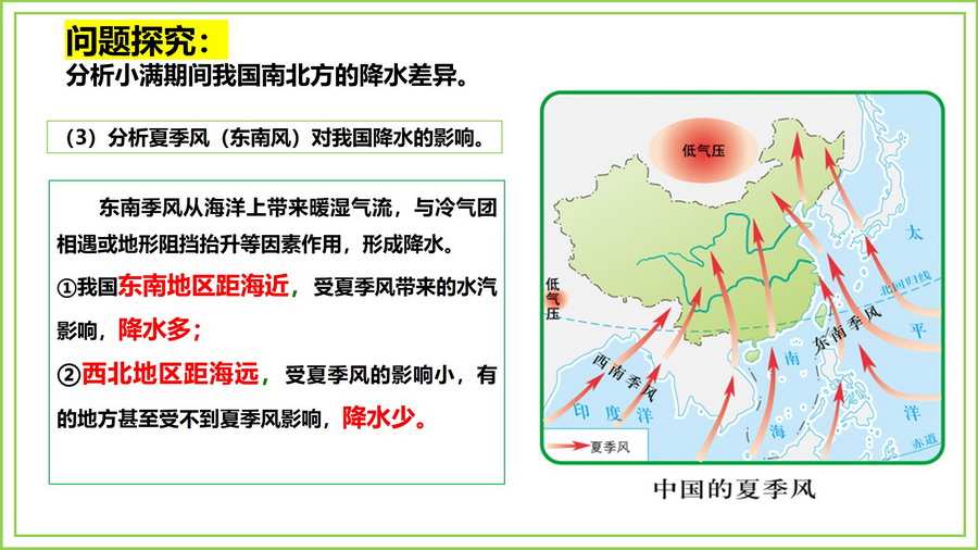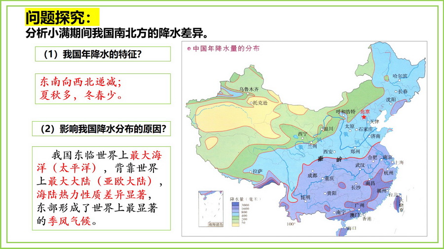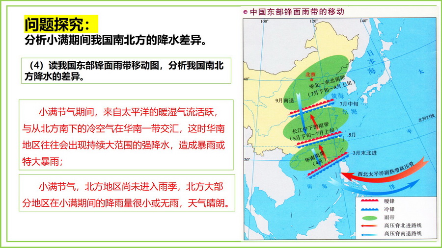 “夏雨催促”,小满时节降水频繁,我国南方地区往往会出现持续大范围的强降水。应用地理知识探究小满节气前后我国南北方降水的差异。