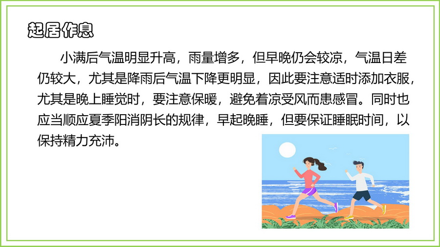 小满到来,人们通常会有祭车神、祈蚕节、食苦菜、抢水等传统文化项目。你还知道立夏时有哪些文化传统呢?我们的起居作息、饮食健康等又该注意哪些细节呢?