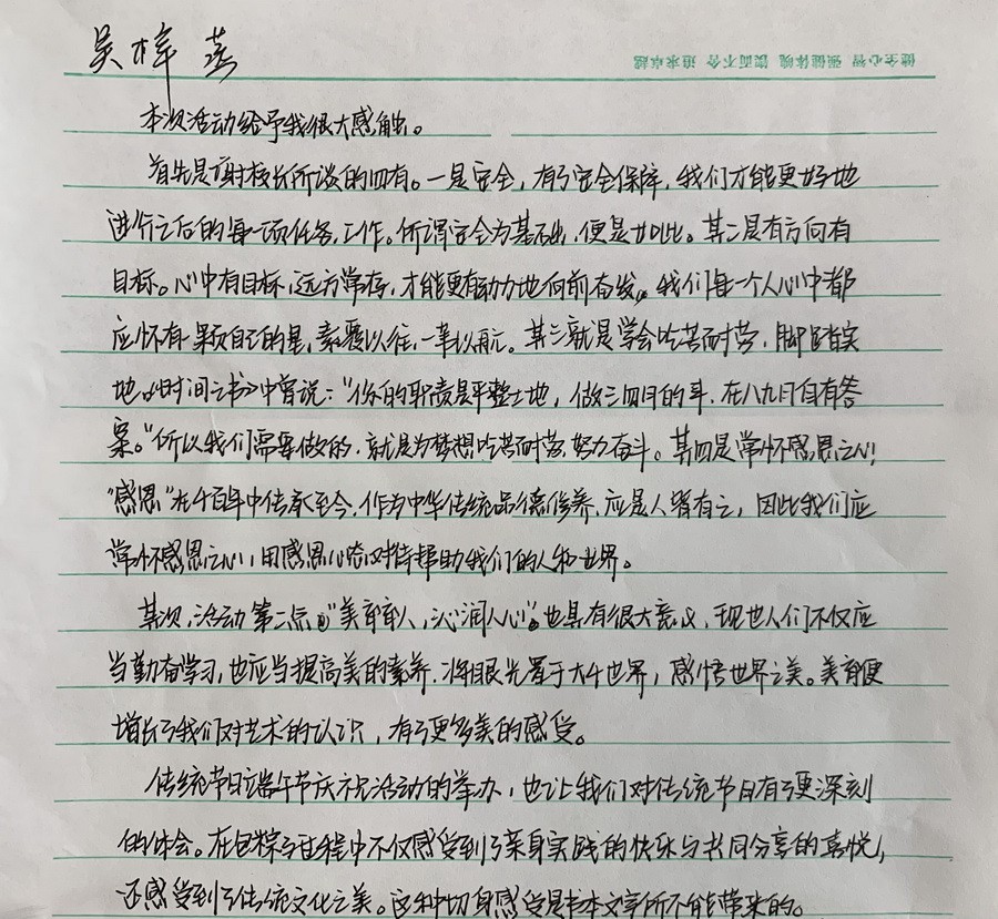 谢鹰校长对学校美育建设提出了四点期望。一是要有感恩之心,“欣逢盛世,感恩时代”,把最好的自己奉献于最好的时代,才是我们求学问道的根本初衷;二是要有明确的目标,“内心的正道已决,那就不再动摇”;三是要有牢固的安全意识,树立“守好小我,就是成就大我”的责任意识,坚定求学拓新的决心信心,为梦想加油;四是要有吃苦耐劳的精神,昂扬向上的激情,洁身自好的品行,让梦想在奋斗中展现价值,让梦想在坚守中开花结果。