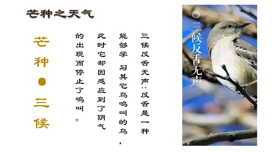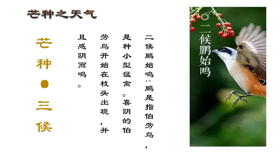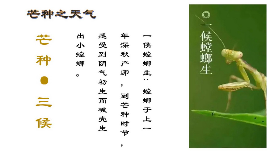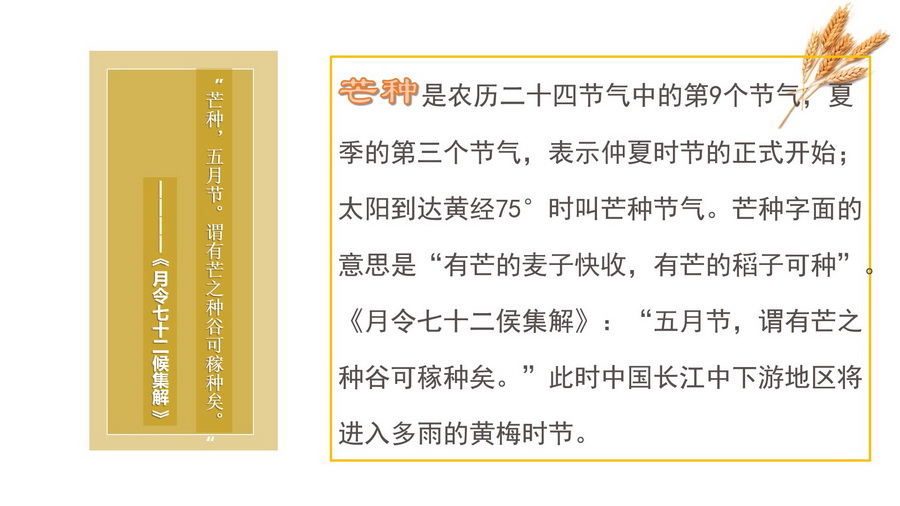 芒种是二十四节气中的第九个节气,一般在公历6月5日前后来临。从最简单的角度来解释,芒种的意思就是“忙着种”。它告诉人们,到了这个时节“有芒的麦子快收,有芒的稻子可种”。可见,芒种是与农业生产关系最为密切的一个节气。随着它的到来,天气将变得炎热,农人也将开始忙绿的田间生活。