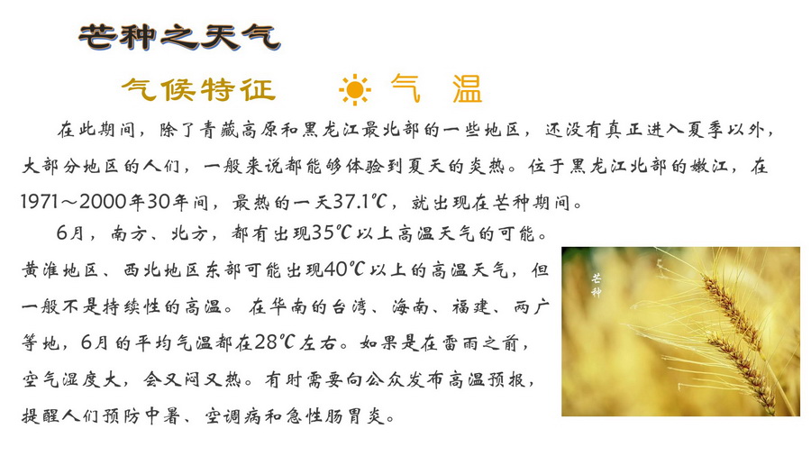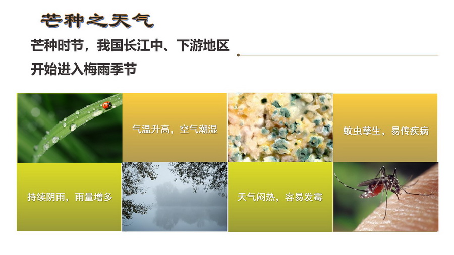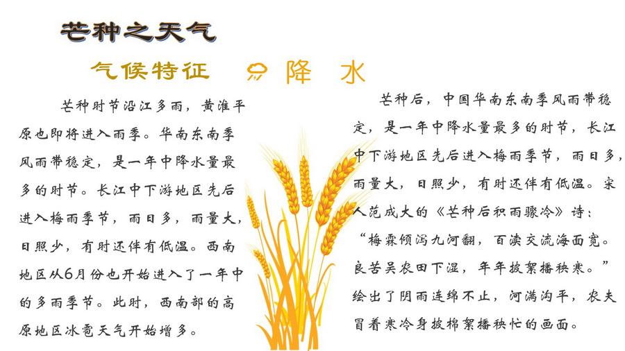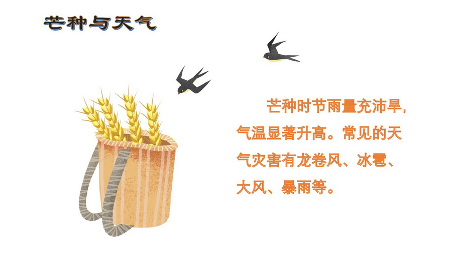 芒种时节雨量充沛旱,气温显著升高。常见的天气灾害有龙卷风、冰雹、大风、暴雨等。