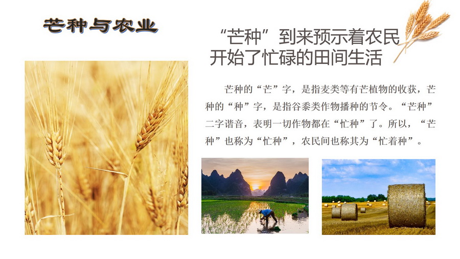 四野芳华收麦忙!天地间的耕作,待时间之馈赠。“芒种”到来预示着农民开始了忙碌的田间生活。“芒种”二字谐音,表明一切作物都在“忙种”了。所以,“芒种”也称为“忙种”,民间也称其为“忙着种”。