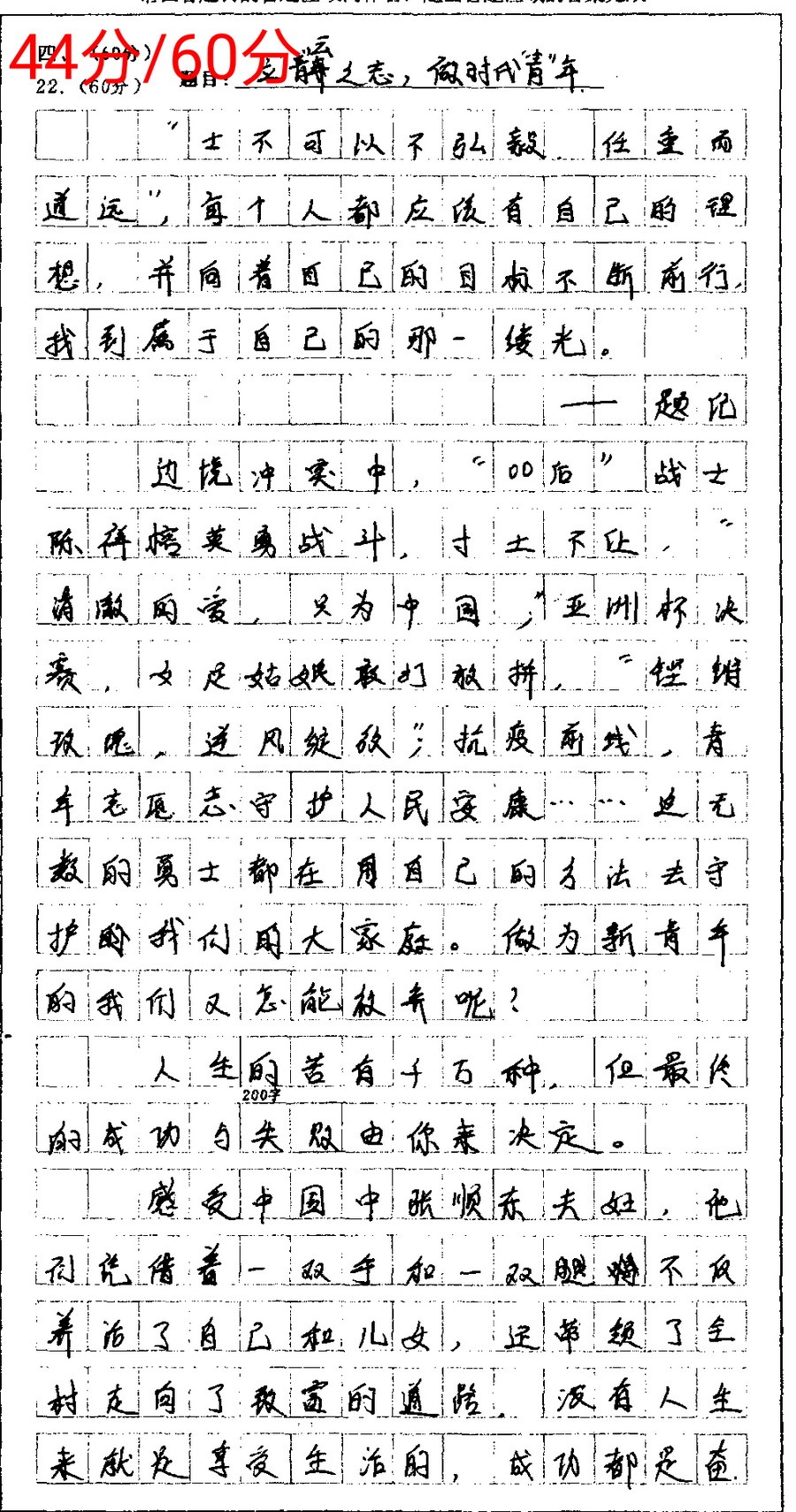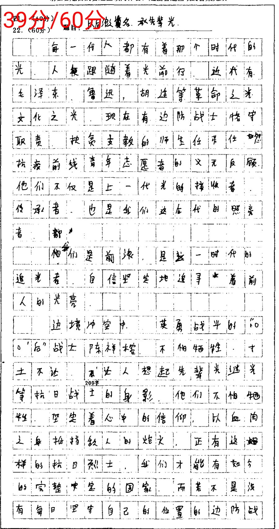3、把点题当成“硬任务”,让关键词有足够的“出场”次数。在显眼的位置(题目、第一段结尾的大观点、中间部分的小观点、小观点后面一段的段尾和段首、全文结尾等)必须直接反复出现话题关键词,从技术层面迫使自己始终不偏离话题,千万不要拐弯抹角地含蓄表达,阅卷老师不喜欢绕弯弯、弯弯绕。很多学生不知道,点关键词是多么的重要,用“一字(词)千金”来比喻真不为过。阅卷场上用得最多的一个词是“穿靴戴帽”,“靴”“帽”指的就是关键词。写着写着就跑了,提一下关键词,就认同为思维回来了,不管是不是真的回来了。就像一个人戴军帽,穿军装,我们就认同他是解放军,不会去深究他是真解放军还是假解放军。有了“靴”,或有了“帽“,分数一下子涨几分,甚至十几分、二十几分。时间紧迫,顾不上逻辑的情况下,不管三七二十一,点了关键词再说。同学们切记,切记,切记!这一点很重要,很重要,很重要!重要的话说三遍。