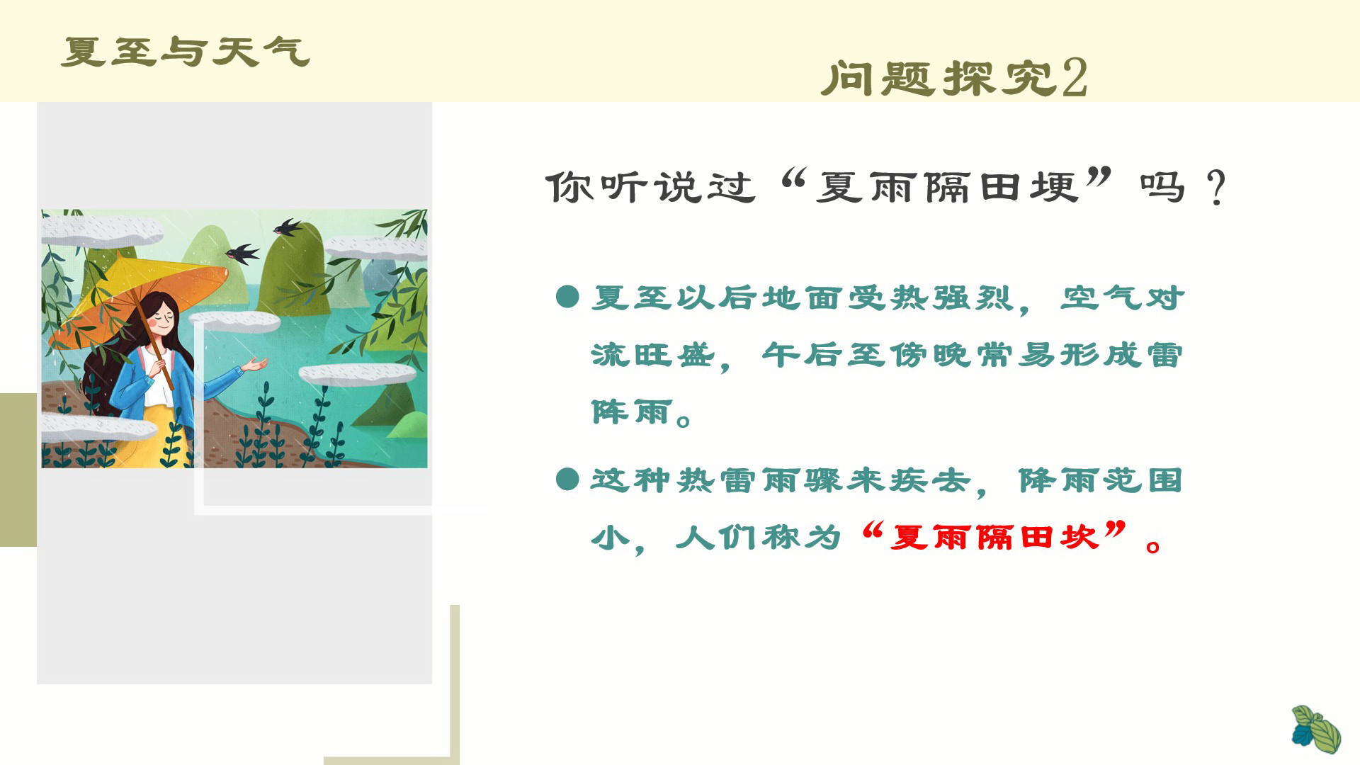 “夏至不过热”、“夏雨隔田埂”、“黄梅家家雨”,看人们发现了大自然中气温、降雨有哪些典型规律。一起探究探究。