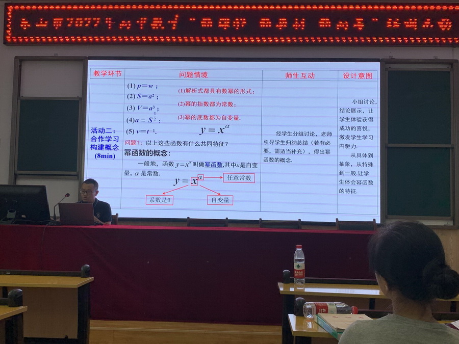 7月13日,各位老师围绕教学设计、备课思路、教学环节、教学目标达成等问题进行了交流展示。程才老师作了题为《3.3幂函数》的发言,从教学分析、目标、重难点和设计四个方面进行了阐述。