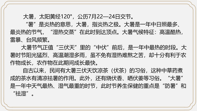大暑,二十四节气之一,夏季最后一个节气。小暑后十五日为大暑,太阳黄经为120°,公历7月22—24日交节。是一年中日照最多、最炎热的节气,“湿热交蒸”在此时到达顶点。