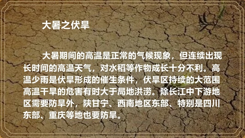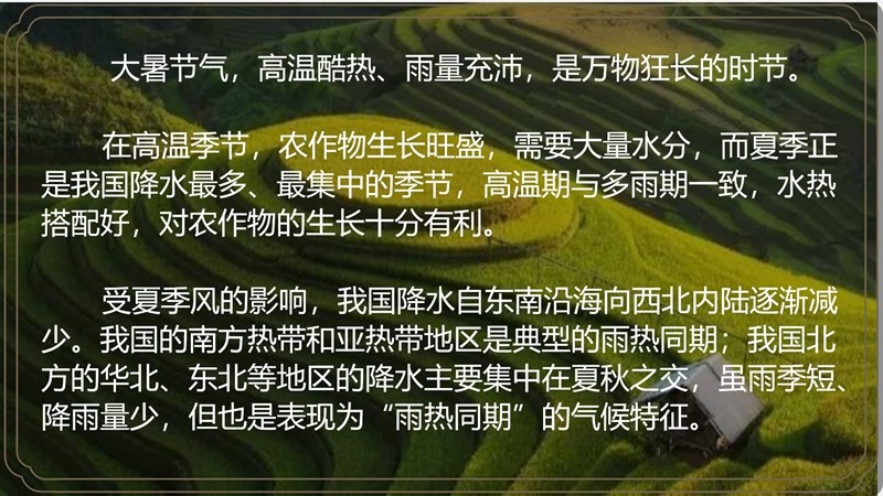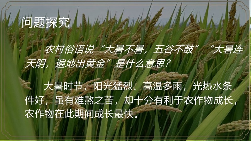 大暑时节阳光猛烈、高温潮湿多雨,虽不免有湿热难熬之苦,却十分有利于农作物成长,农作物在此期间成长最快。