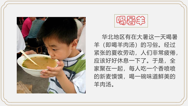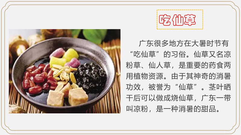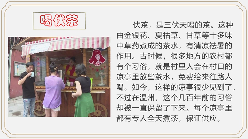 自古以来,民间有大暑三伏天饮凉茶(伏茶)的习俗,这种中草药煮成的茶水有清凉祛暑的作用。此外,还有烧伏香、晒伏姜等习俗。因为是在天气最热、湿气最重时节,养生保健的重点是“防暑”和“祛湿”。