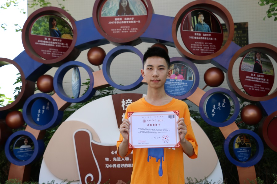 “谭森元同学,祝贺你被我校机械与动力工程学院核工程和核技术专业录取!欢迎你成为一名新交大人!期待你在未来的征程中,将未至之境、星空之梦、灯塔之光化为矢志不渝的奋斗脚步,拥抱人生的无穷未来!”2022年7月31日下午2点半,理科学生谭森元从井研赶到乐山立志达高级中学,领取上海交通大学录取通知书。一打开仪式感满满的录取通知书,谭森元露出了笑容。