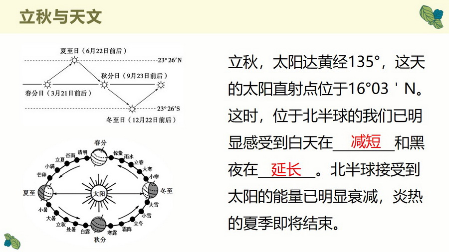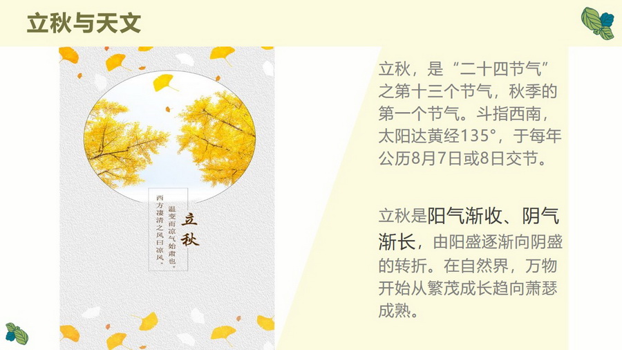 立秋,是“二十四节气”之第十三个节气,秋季的第一个节气。斗指西南,太阳达黄经135°,于每年公历8月7、8或9日交节。《中国天文年历》显示,北京时间2022年8月7日20时28分57秒将迎来“立秋”节气。