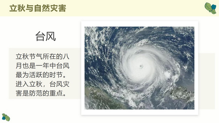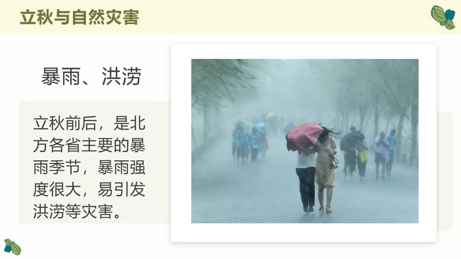 除了高温炎热,立秋期间,暴雨、台风等灾害性天气仍然多发,华北、东北等北方部分地区正值多雨季节,华南及东南沿海还会不时遭遇台风影响。
