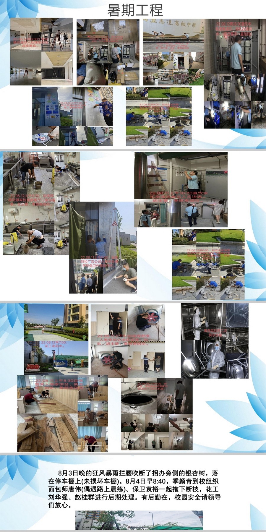 后勤部长季颜青以图片展播的方式对暑期工作、维修工作进行了全面回顾,历程令人难忘,成绩来之不易。充分展现了后勤部暑期各项工作的落地轨迹和对开学形势的清醒研判;现场宣读并诠释了《后勤部2022一2023学年度上期工作计划》,提出本学期全体后勤人要凝心聚力“快”起来,精准施策“干”起来,闯关夺隘“创”起来,自我加压“严”起来的工作总基调,助力学校高质量发展过程中的各项新理念、新部署、新要求。