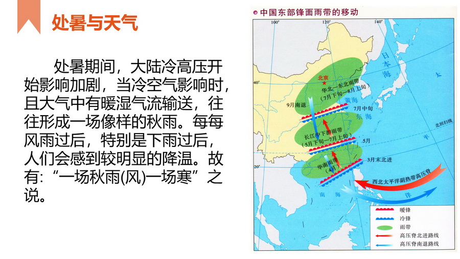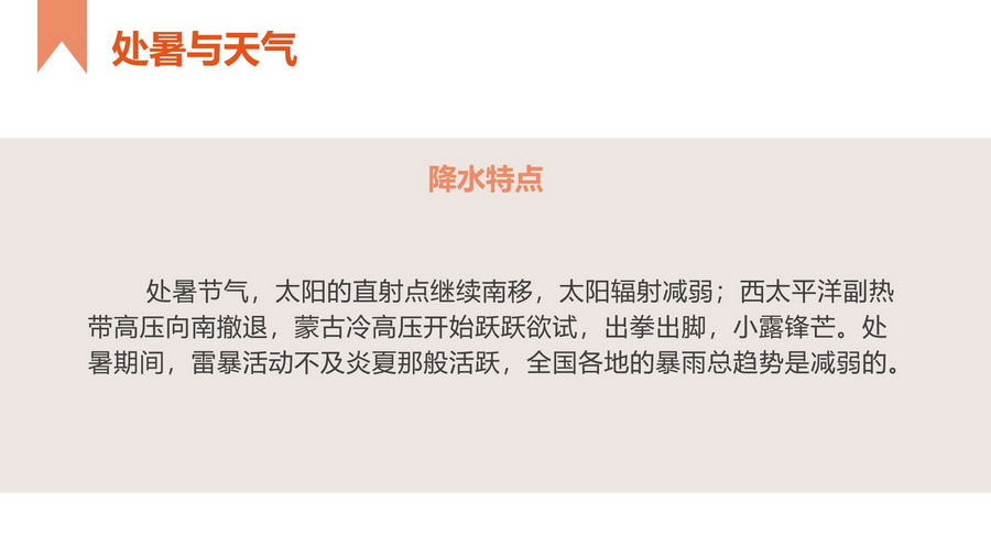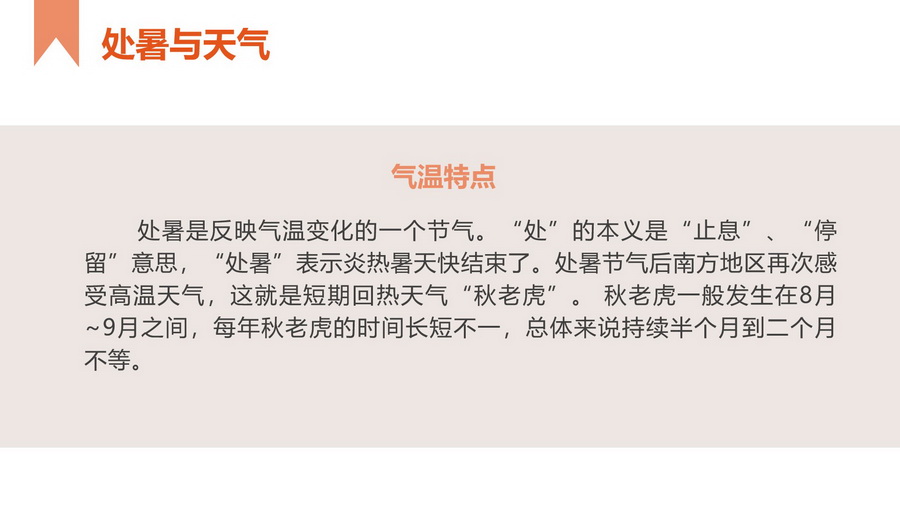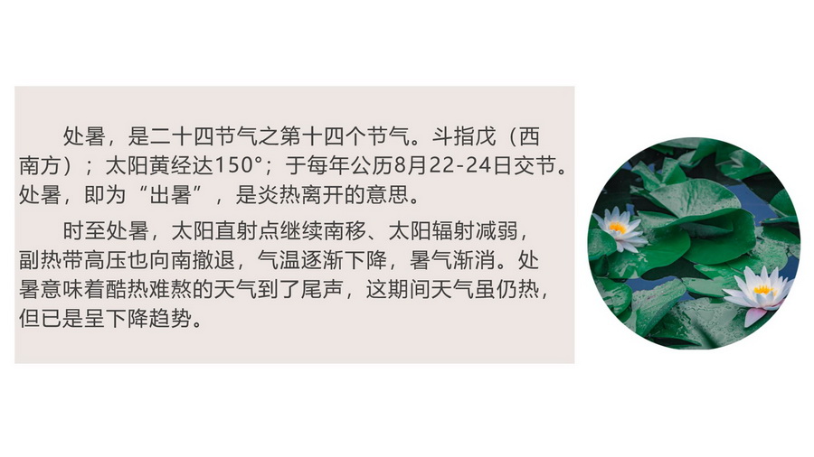 处暑是反映气温变化的一个节气。“处”的本意是“止息”、“停留”意思,“处暑”表示炎热暑天快结束了。随着太阳高度的继续降低,所带来的热力也随之减弱。但是气温就会随之下降么?