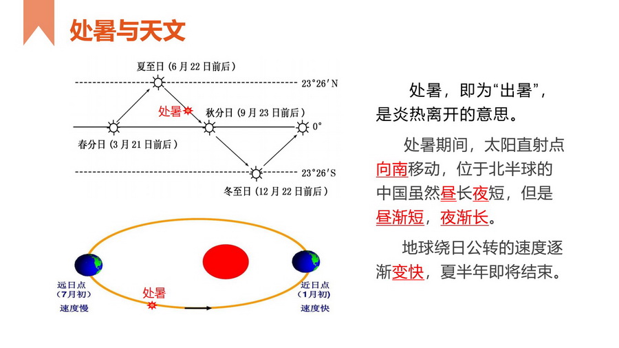 二十四节气,是干支历中表示自然节律变化以及确立“十二月建”(时令)的特定节令,它最初是依据“斗转星移”制定。处暑,“二十四节气”之一,秋季的第二个节气。斗指戊(西南方);太阳黄经达150°;于每年公历8月22-24日交节。