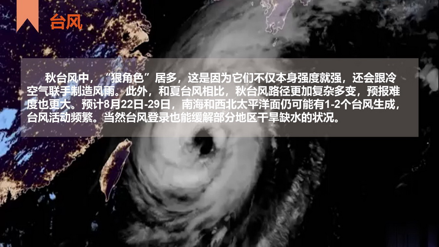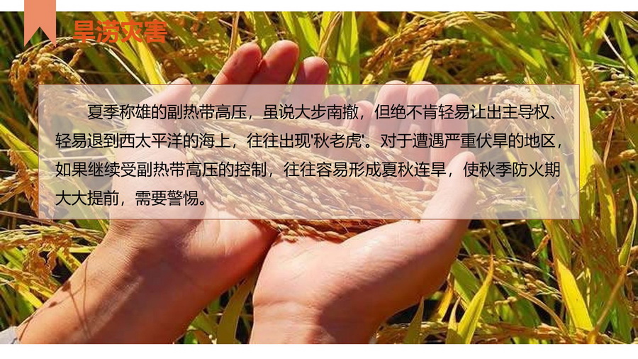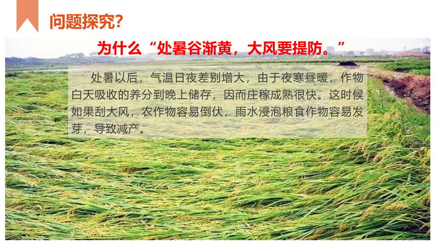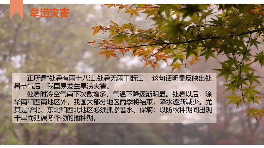 正所谓"处暑有雨十八江,处暑无雨干断江"。处暑时既有滂沱大雨,又有旱地千里,沿海台风侵袭。