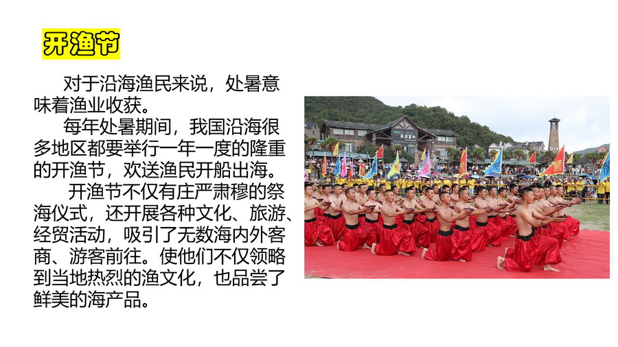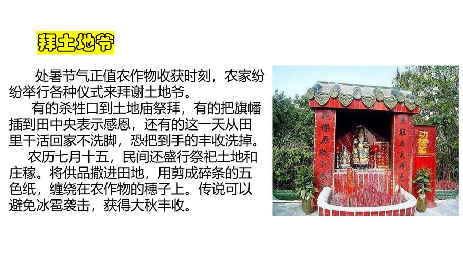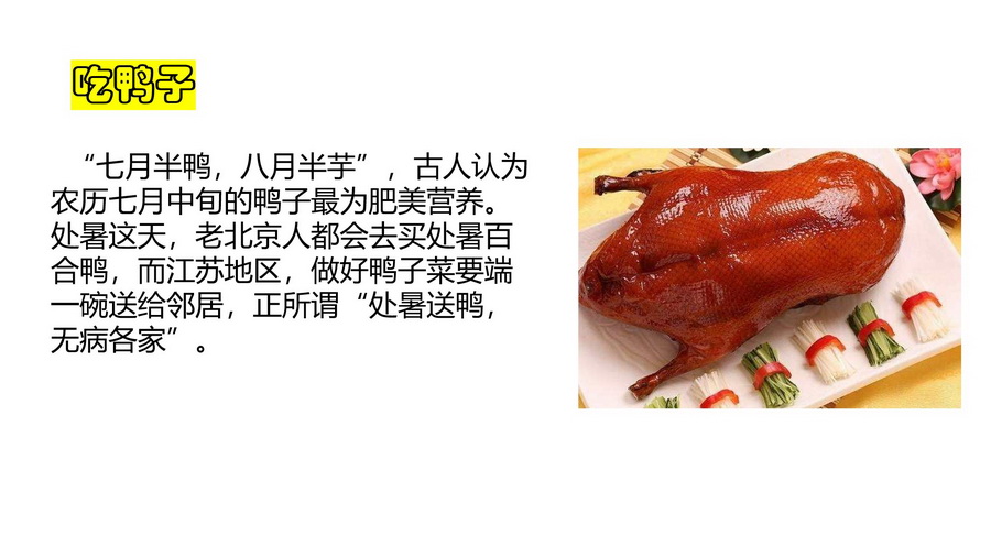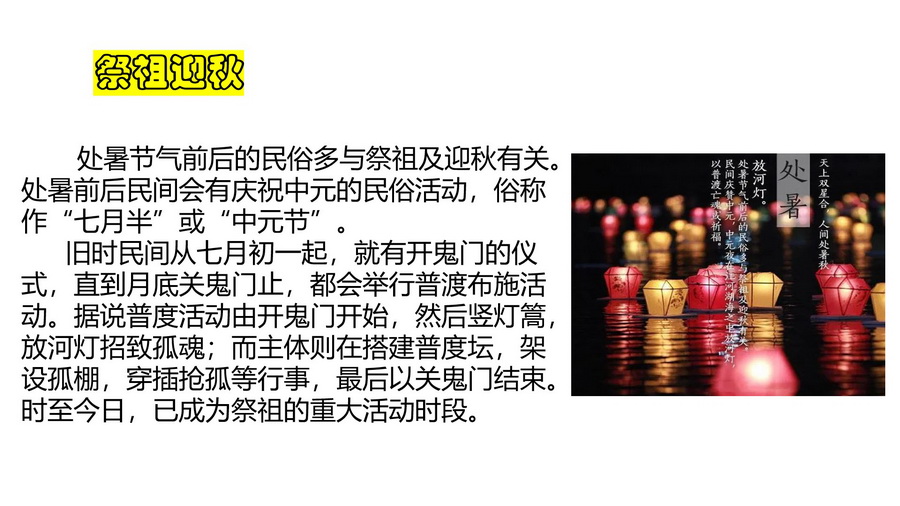 处暑到来,人们通常会有祭祖迎秋、吃鸭子、开渔节、拜土地爷等传统文化项目。你的家乡处暑时有哪些文化传统项目呢?
