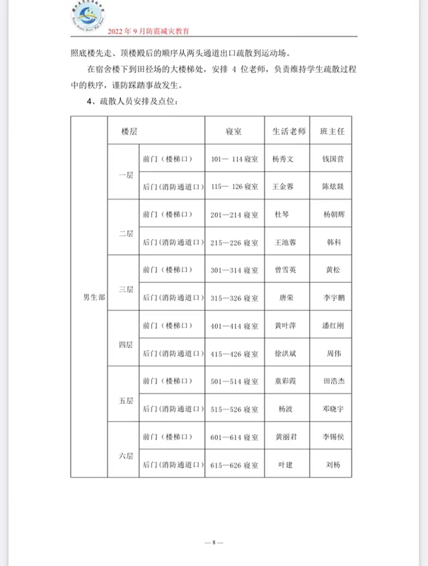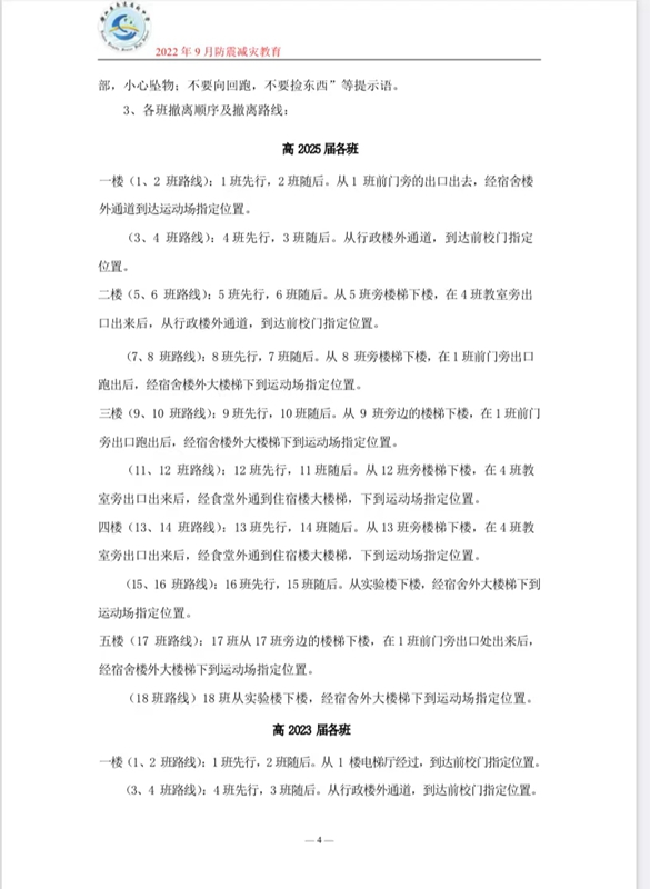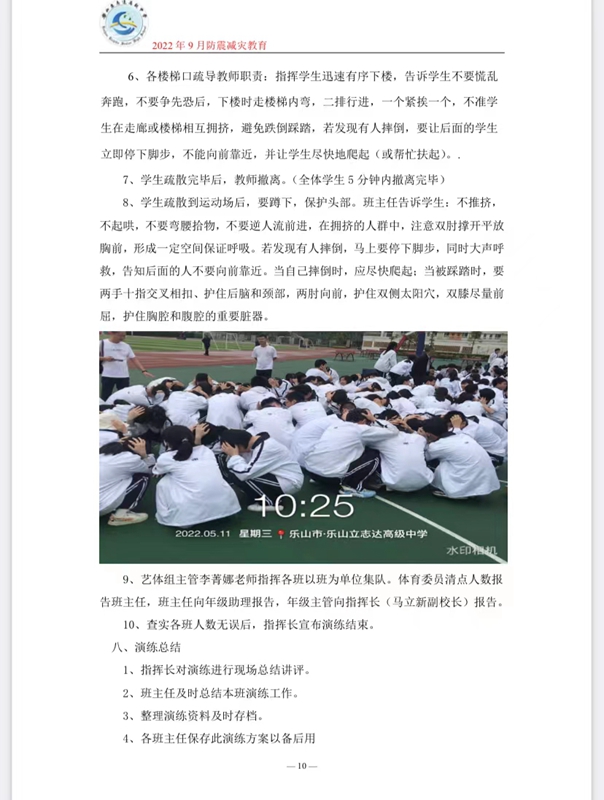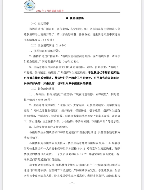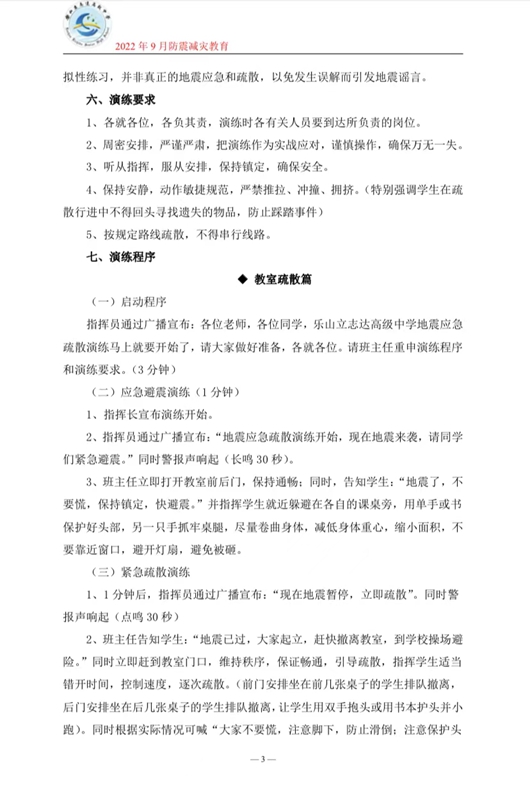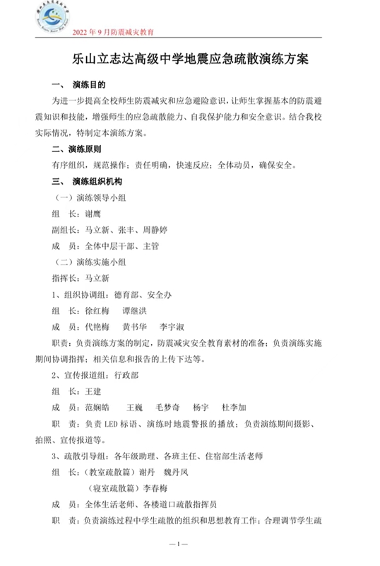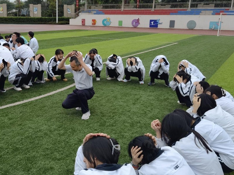 2022年9月5日12时52分,四川甘孜州泸定县发生6.8级地震,甘孜州与雅安市受灾严重。训练有素,才应对突发危机。为切实加强学校安全工作、有效应对突发险情、强化全校师生防震的安全意识、提高师生防患避险能力、检验学校安全工作执行力度和紧急疏散工作效率,乐山立志达高级中学于2022年9月8日组织开展地震逃生演练活动。
