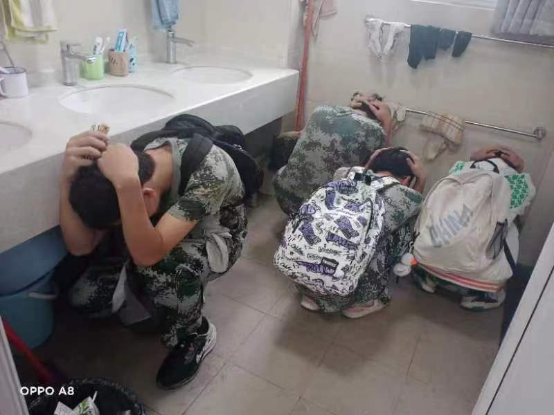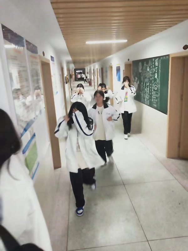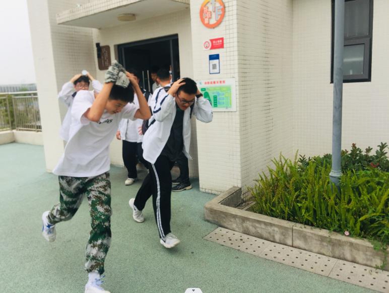 上午9点55分,演练领导小组,全体班主任、疏散引导组及其演练组织人员提前就位;10点整,防震避险警报准时响起,全体学生在班主任的带领下进行应急避震演练,迅速护头,就近躲避;1分钟后,紧急疏散信号启动,各班按照既定撤离顺序及撤离路线在疏散引导组的引导下,有序疏散至运动场指定位置。