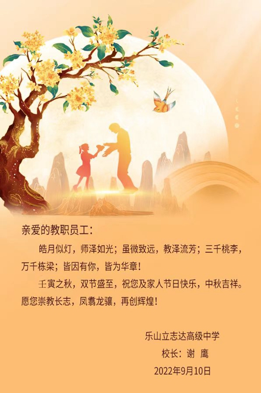 丹心绘春秋,青丝映日月;节日快乐,中秋安康。在新学期伊始,校长谢鹰在入学典礼上说:“我校能打胜仗、常打胜仗、必打胜仗的强大自信和卓绝实力,来自于全体师生员工焚膏继晷、晨昏弗懈努力的结果,鲜花和荣誉理应属于你们。”的确,在立志达高级中学这个和谐奋进、携手致远的大家庭中,我们既是最好的伙伴,也是最亲的家人。相信在家人们的共同努力下,立志达高级中学这个大家庭定能桃李芬芳,誉满嘉州。