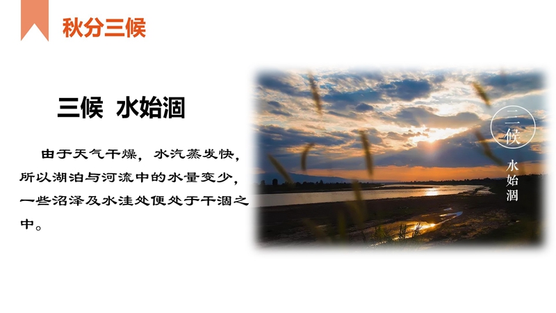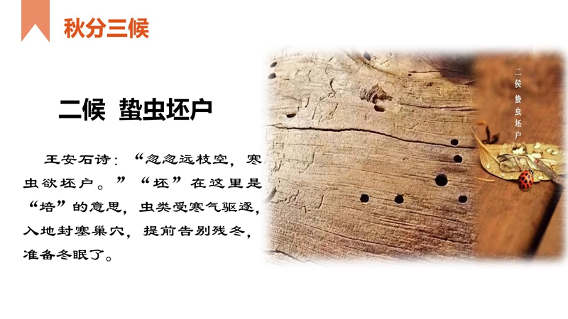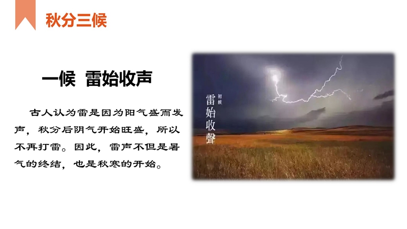 《春秋繁露·阴阳出入上下篇》云:“秋分者,阴阳相伴也,故昼夜均而寒暑平。”这也是秋分最大的特征。我国古人划定秋分有三候:一候雷始收声,二候蛰虫坯户,三候水始涸。