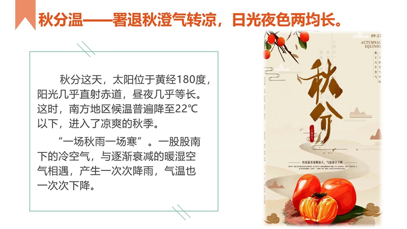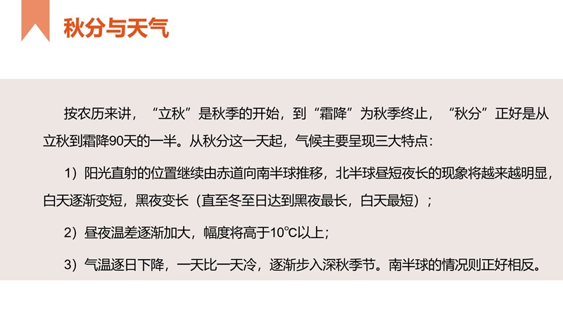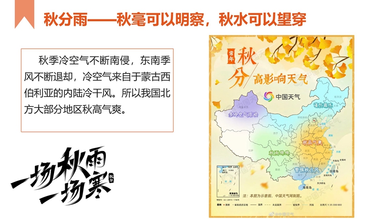 秋分至,暑热尽。秋分节气期间,随着太阳直射点继续向南移动,北半球白昼越来越短,气温逐日下降,我国秋季版图也将达到鼎盛。