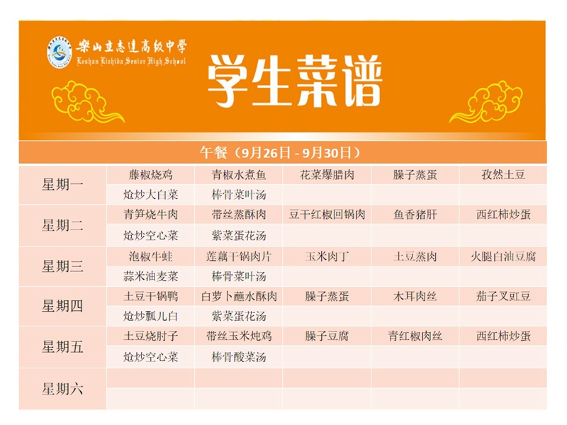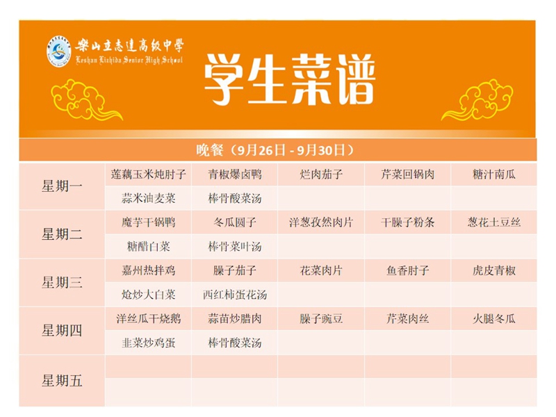 立志达高级中学菜谱(9月26日—9月30日)
