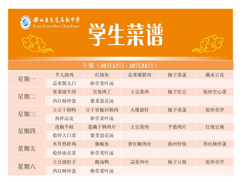 立志达高级中学菜谱(10月17日—10月22日)